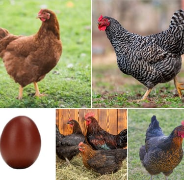 Rhode Island Red - Rhode Island may be America’s smallest state, but the breed developed there in the late 1800s made huge changes in chicken husbandry. The Rhode Island Red’s amazing ability to lay about 265 eggs a year made it famous worldwide and became the parent of several modern hybrid egg layers. These glossy mahogany-colored hens with black tail feathers are as beautiful as they are gentle and productive. Purpose: Egg Layer Production: 265 Large Brown Eggs/Year Temperament: Exuberant, Curious, Friendly Mature Weight: 6-7 lbs. Hardiness: Cold and Heat Hardy.