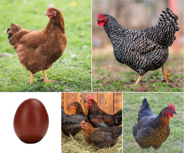 Mocha Marrans - This breed is also known as Novogen’s Color Chocolate and was developed to have dark chocolate brown eggs. The Mocha Maran is a cross between Novogen’s bloodline of Rhode Island Red hen and their French Black Copper Maran rooster. This combination creates a beautiful bird with rustic or reddish-brown tones paired with a darker brown to black body. They are known to adapt well to all living environments. Chicks are able to be color sexed, guaranteeing near 100% gender accuracy. Due to the cross some may develop feathered legs while others will not.. If you’re looking to impress with a colorful egg basket, the Maran is a must have staple for any backyard.